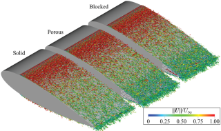 Simulation of a turbulent flow along a wing profile with one solid end, one porous end, and one porous end blocking full flow along the chord line. Simulation carried out by TU Delft within the SmartANSWER project.